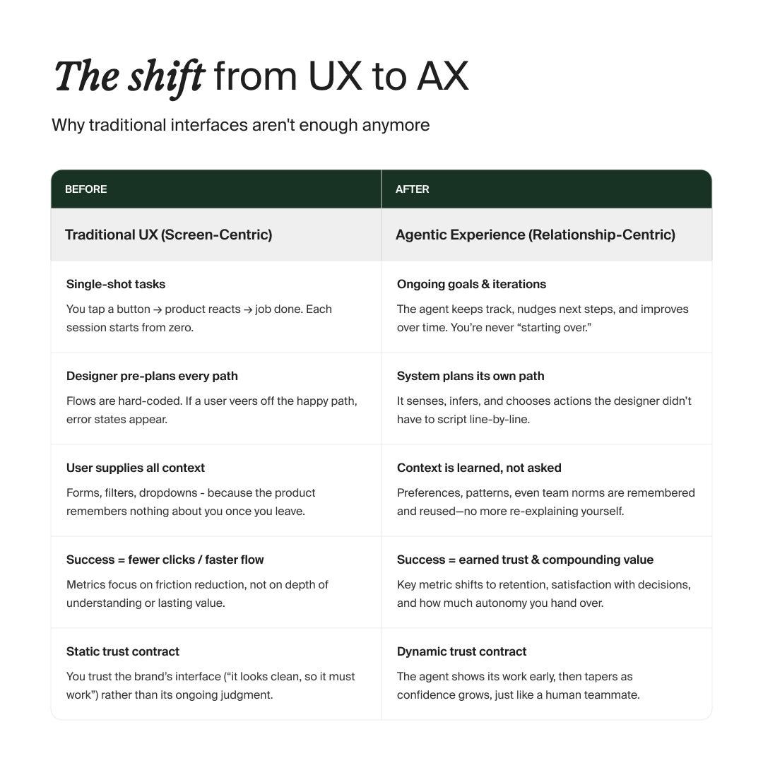 We’re moving from screen-centric UX, where every session starts from zero, to relationship-centric AX (Agentic Experience), where products act as competent collaborators. AX systems learn from interactions, remember user preferences, and make decisions on their own—creating more value the longer they’re used.