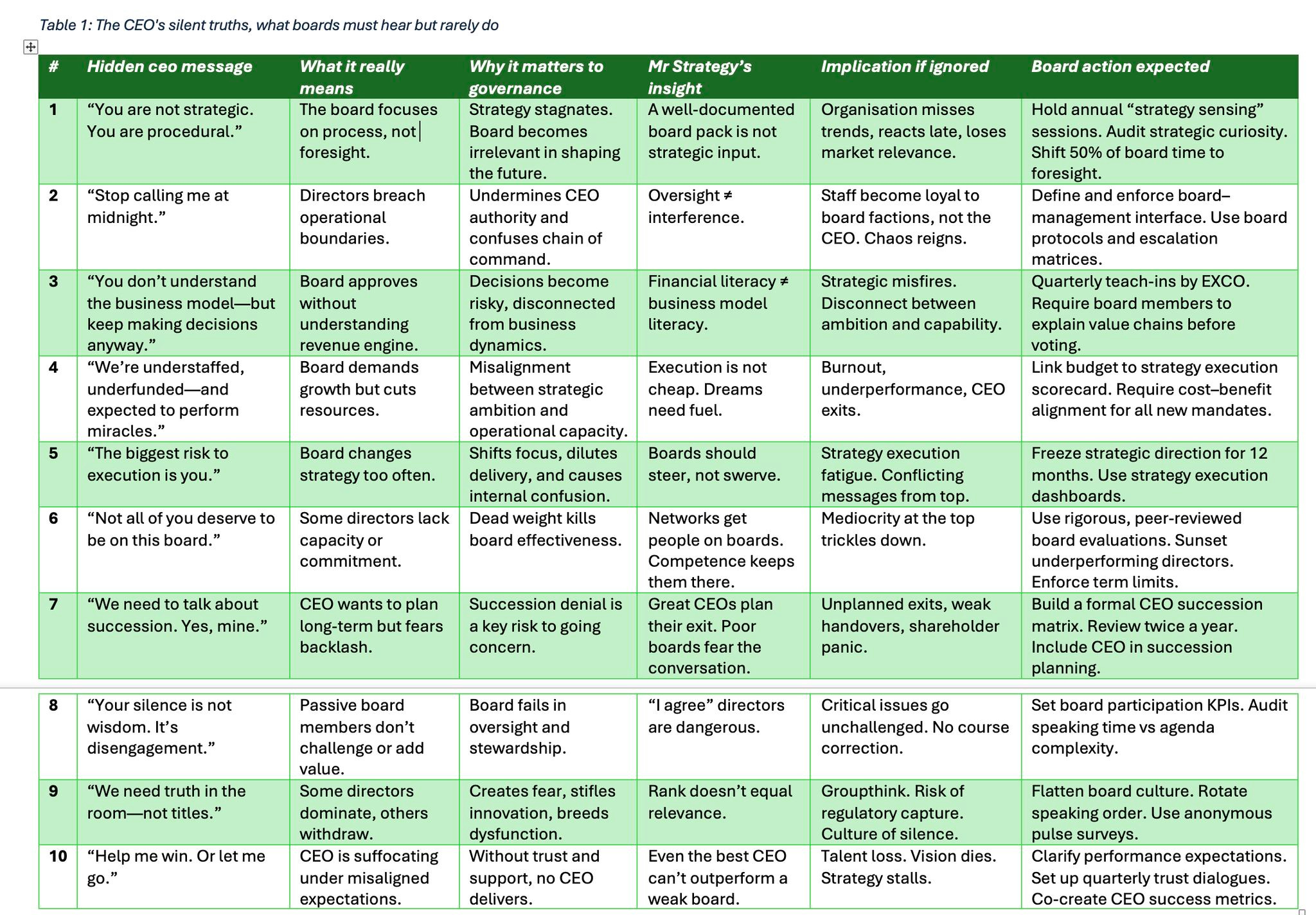 I enjoyed"Mr. Strategy’s" decode of what CEOs want boards to know — but are often afraid to say.